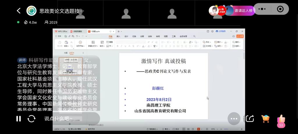 此次研修班主题围绕着“思政类论文选题思路与规范技巧”、“思想政治教育理论与实践与实践类论文研究主题与研究问题的寻找方法”等。通过主讲专家的精彩深入的讲解,从确定选题、文献综述、提升写作技巧到论文写作与投稿,为参会教师提升科研水平、项目申报和论文写作水平搭建桥梁,帮助教师厘清思政科学研究思路,提升科研项目申报质量,促进科研成果的产出,以助力参会教师获得更高更高质量的职业发展。彭颜红教授还分享了作为思政教师的成功宝典,那就是要有执着的事业追求、要有长期的学术积累,更要有优秀的写作功底。