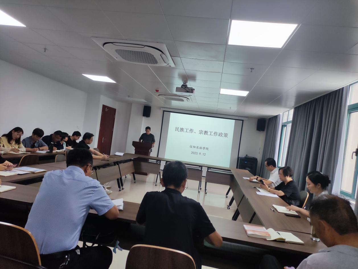 为全面落实中央民族工作会议精神和全国宗教工作会议精神,引导学院教师进一步铸牢中华民族共同体意识,9月12日下午,马克思主义学院在学术交流中心509会议室召开民族宗教工作宣讲会,由潘军老师进行宣讲。