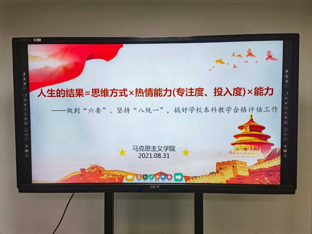 2021年8月31日下午,马克思主义学院在综合办公楼304会议室以“人生的结果=思维方式×热情能力(专注度、投入度)×能力——做到‘六要’、坚持‘八统一’,搞好学校本科教学合格评估”为主题开展“迎评促建”活动。会议由院长邱兴平主持,学院全体教师参加。
