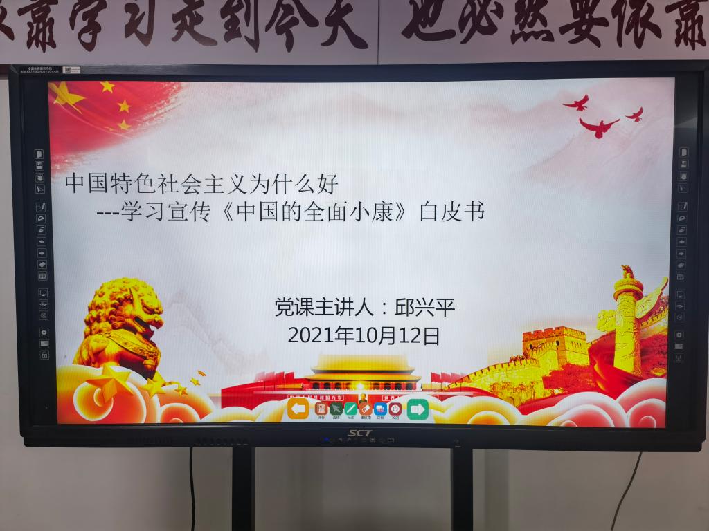 邱兴平为全体教师讲授《中国特色社会主义为什么好——学习宣传<中国的全面小康>白皮书》专题党课。他从迈向中华民族伟大复兴的关键一步、全面小康是全面发展的小康、全面小康是全体人民的小康、全面小康是奋斗出来的小康、中国全面小康的世界意义五个方面展开讲解,对教师们开展了党课教育。