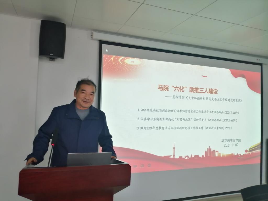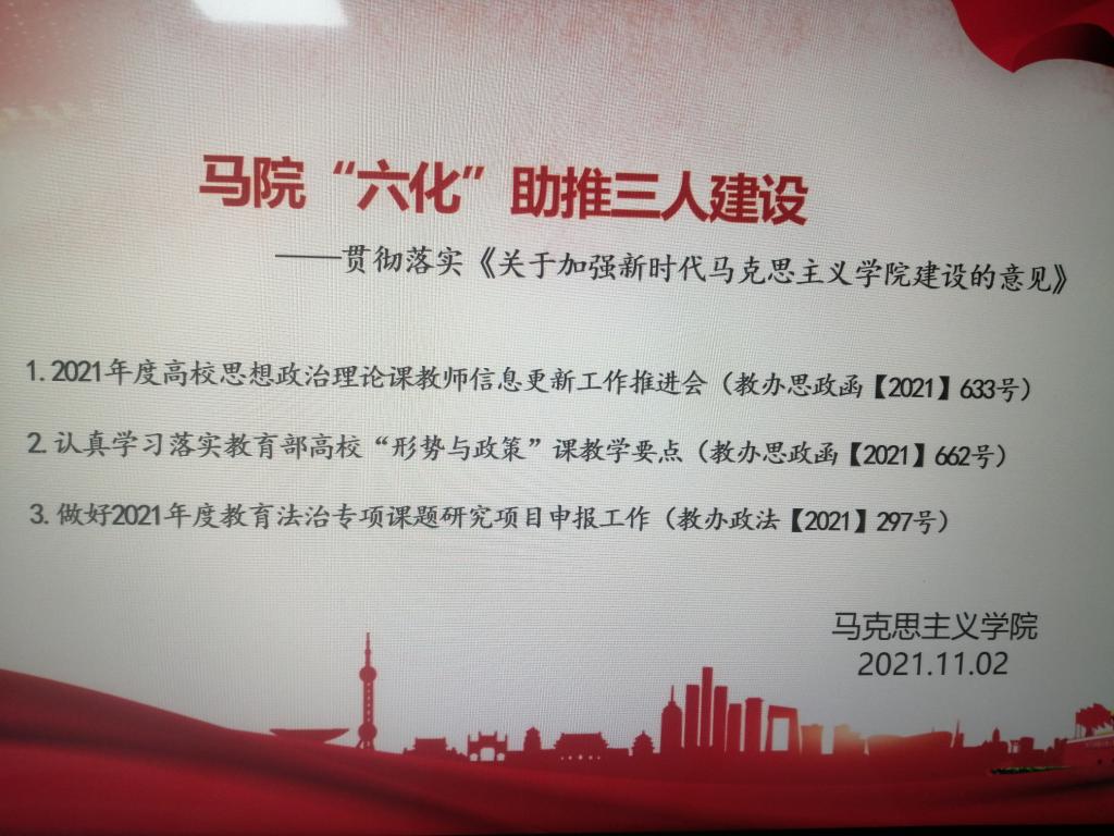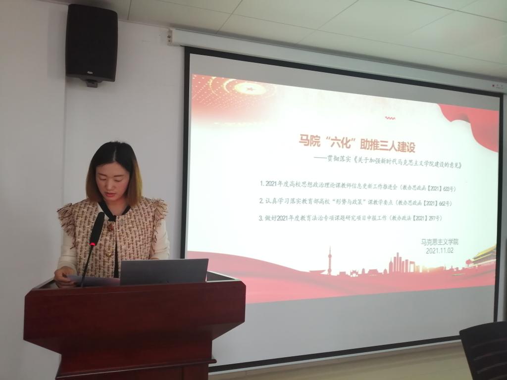 2021年11月2日下午,马克思主义学院在学术交流中心509开展了以“马院“六化”助推三人建设----贯彻落实《关于加强新时代马克思主义学院建设的意见》”为主题的“高质量发展”活动。会议由副院长周俊主持,学院全体教师参加。张曙光、李晓娟、马腾骧、方锐四位教师作主题发言。