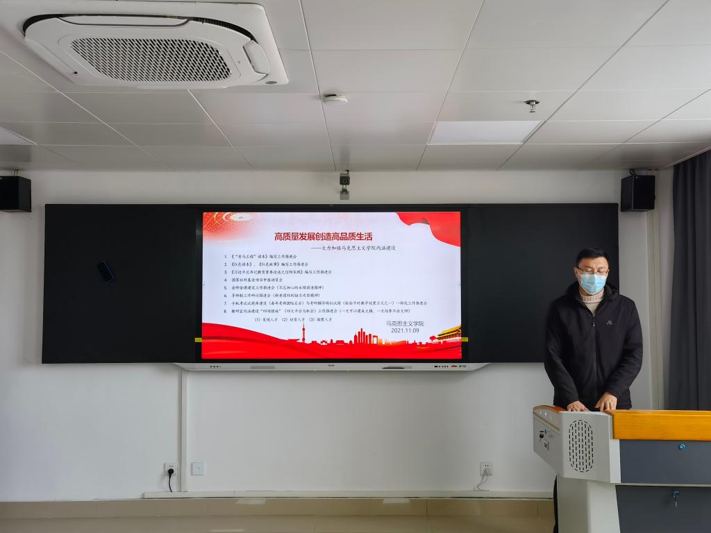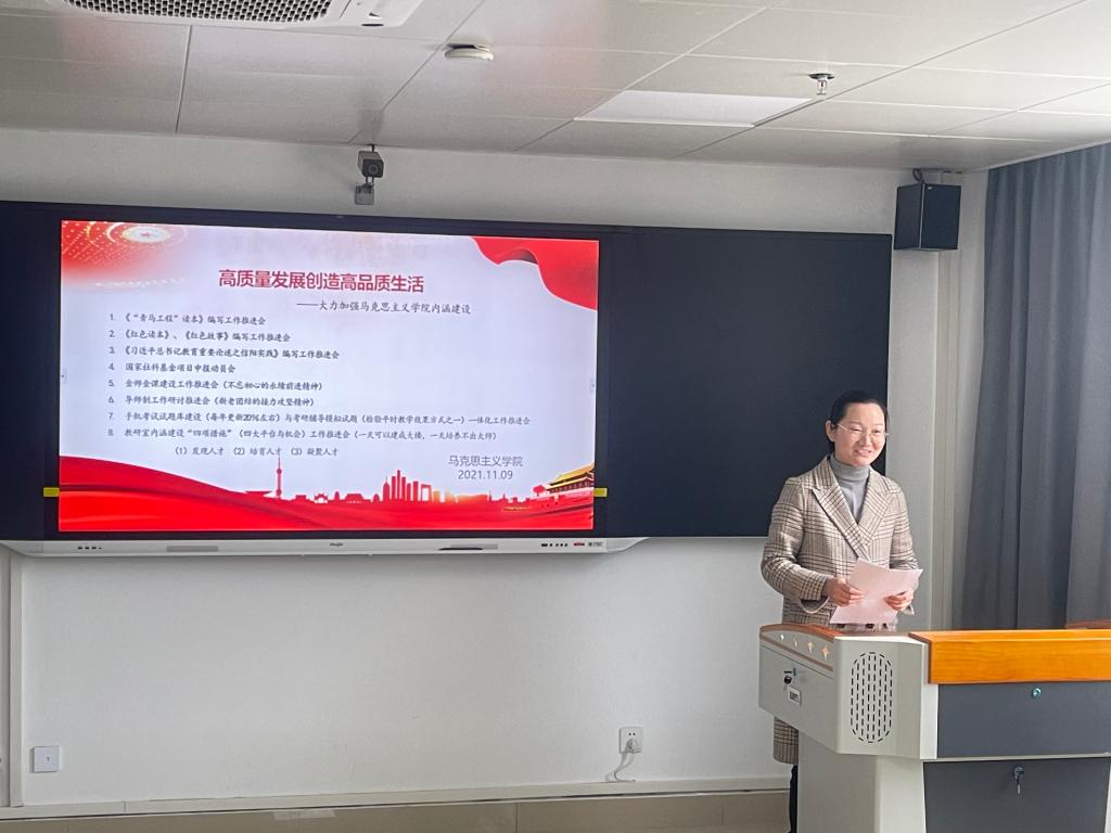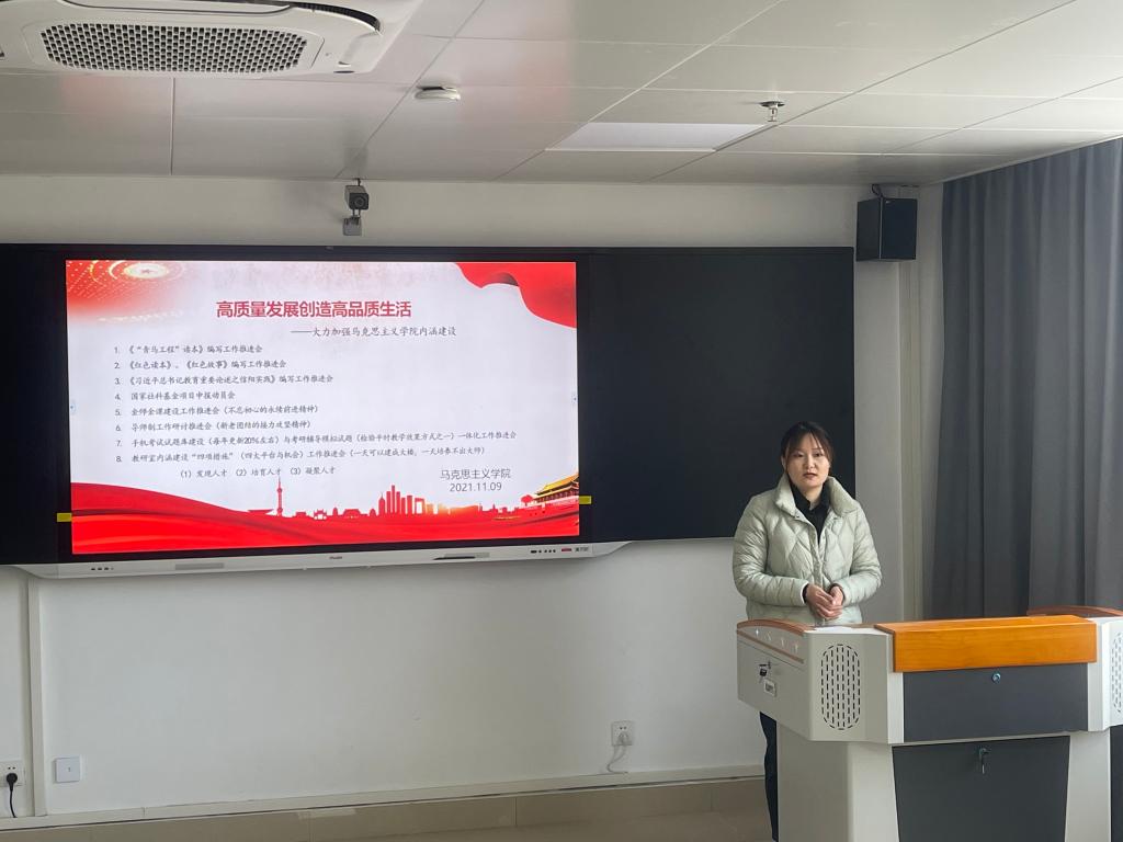 2021年11月9日下午,马克思主义学院在学术交流中心513室开展了以“高质量发展创造高品质生活——大力加强马克思主义学院内涵建设”为主题的“高质量发展”活动。会议由郑盼杰主持,学院全体教师参加。卫飞、张坤、龚甜甜三位教师作主题发言。