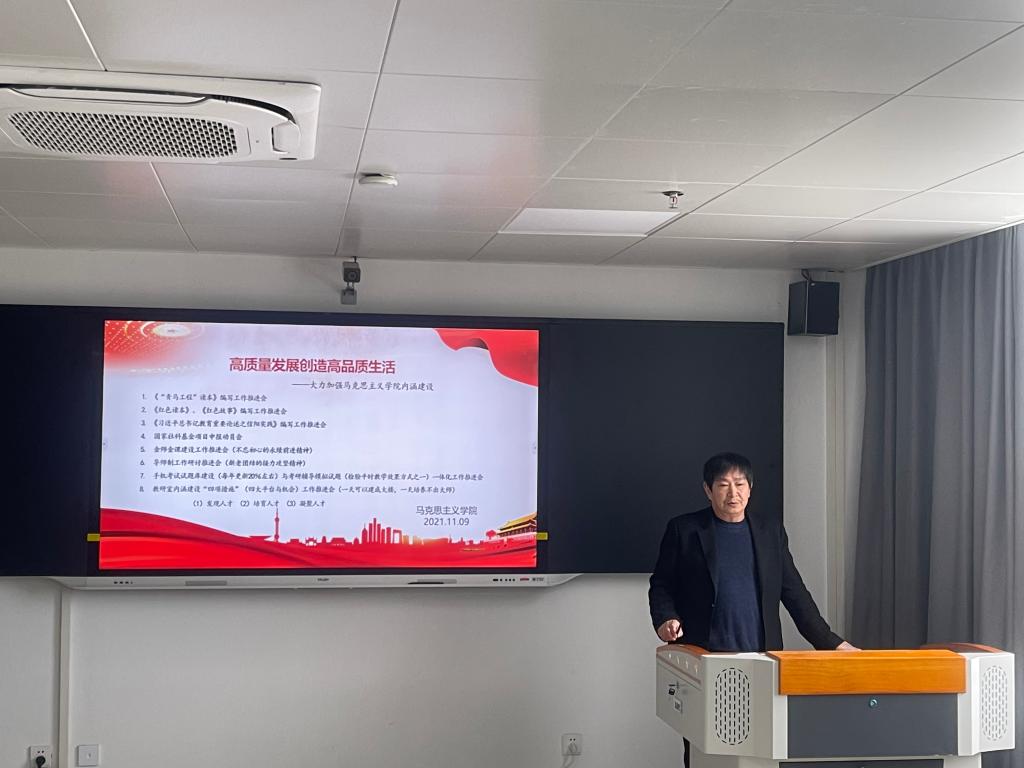 院长邱兴平作总结发言。首先,传达了2021年11月8日下午在综合办公楼一楼召开的学校2021秋冬学期第二次教学工作例会精神(第一,做好疫情紧急状态下的教学工作,线下线上教学相结合。第二,珍惜评建成果,发扬成功经验,持续推进“以评促改”工作,抓好课堂教学管理和教学质量。第三,以下一阶段学校“青年教师课堂教学技能大赛”为契机,以赛促改、以赛促练、以赛促教,激发青年教师的教学热情,培养青年教师的教学能力,提升青年教师的教学水平)。其次,传达了2021年11月9日上午在综合办公楼617会议室召开的学校党委会精神(党委副书记王庆兵领学中共中央办公厅印发的《关于加强新时代马克思主义学院建设的意见》,马克思主义学院院长汇报马克思主义学院建设情况,参加会议党委委员纷纷表示加强马克思主义学院是政治任务,应当大力加强。党委书记余作斌对标对表思政课建设要求作总结讲话,强调指出:一是坚持如下原则:1.采取切实措施把“马克思主义学院”作为重点学院来建设,配齐建强领导班子,随学校经济条件逐步落实思政课教师岗位津贴。2.采取切实措施把“五门思政课”作为重点课程来建设。3.采取切实措施把“思政课教师”作为骨干教师来培养。4.成立书记校长为第一责任人的“思政课建设领导小组”作为保障以督查贯彻落实加强马克思主义学院措施。二是具体措施有:1.成立马克思主义学院党总支,加强政治建设。2.一视同仁,统一学校教师工作量与学时系数计算,切实增强思政课教师的使命感、认同感、获得感。3.立足新时代中国特色社会主义鲜活实践,成立思政课实践教学教研室,找准切入点、聚焦点、结合点,加强马克思主义理论研究宣传。4.每年拨付至少生均40元经费用于思政课教师的学术交流、实践研修等,且逐年递增。5.思政课教师职称评聘单列。6.配齐建优教师队伍,落实中班教学、小班研讨之教学组织形式。7.加强与北京大学马克思主义学院、河南农业大学马克思主义学院的沟通与联系,发挥他的示范带头作用,加速青年教师成长。8.择机设立相关科研宣传岗位,切实发挥信阳马克思主义学院的影响力,加大马克思主义研究宣传力度)。第三,要求全体思政课教师要超前谋划,把外在优势转化为独特资源、把外在压力转化动力,以马克思主义学院为平台,补台不拆台,落实教研室内涵建设“四项措施”,建好建强教学基层组织,为学校五年后的审核评估顺利通过贡献力量。