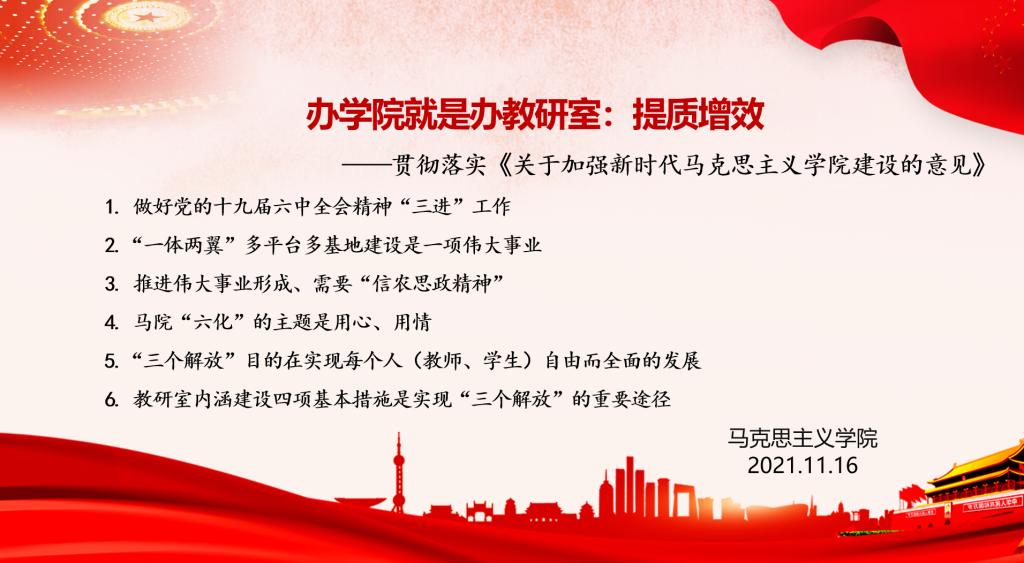 参观结束后,所有教师返回学术交流中心509会议室。为扎实推动党的十九届六中全会精神在beat365在线平台官网迅速掀起学习高潮,落地生根,校党委副书记王庆兵来到马克思主义学院宣讲党的十九届六中全会精神并参加学院理论学习中心组扩大专题学习会。会议由邱兴平主持。