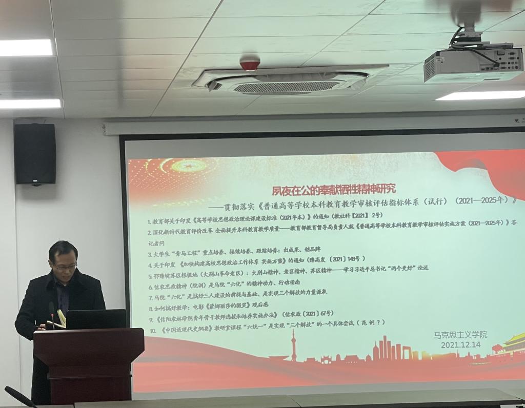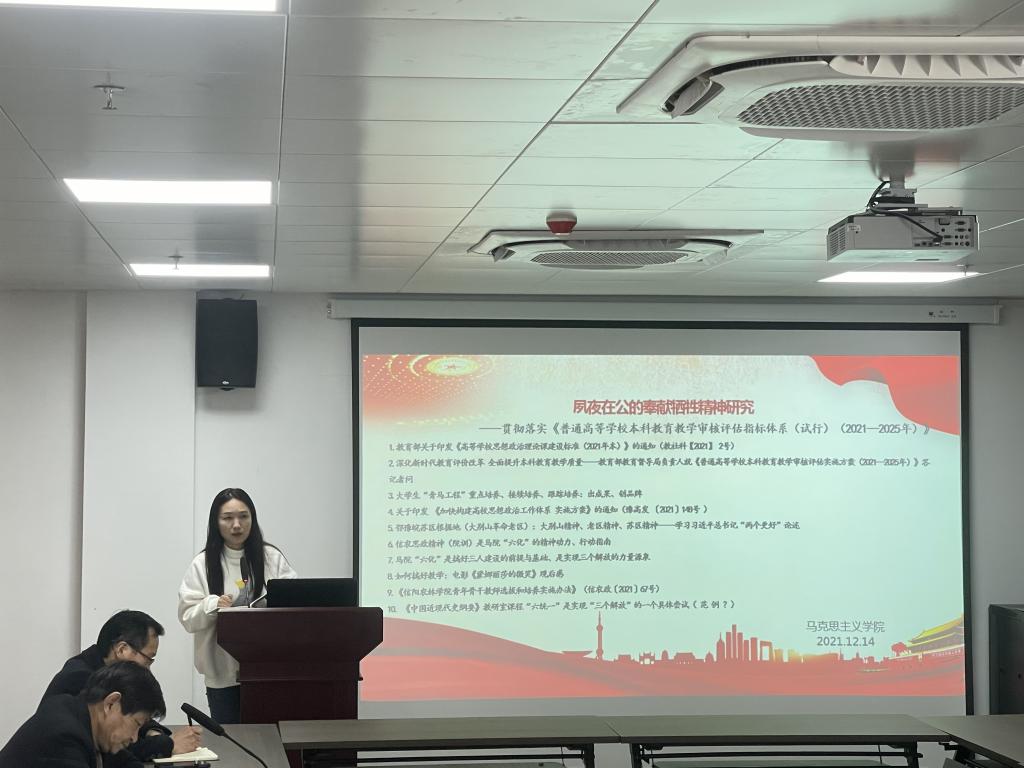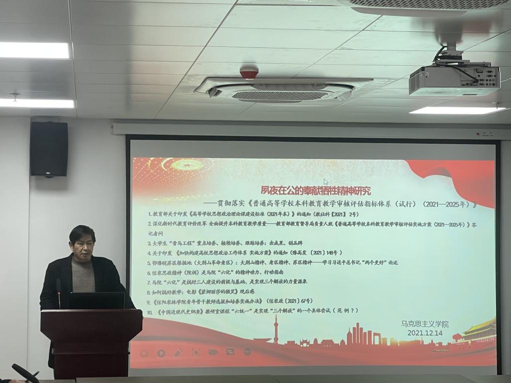 12月14日下午,马克思主义学院在学术交流中心509会议室开展了以“夙夜在公的奉献牺牲精神研究---贯彻落实《普通高等学校本科教育教学审核评估指标体系(试行)(2021—2025年)》”为主题的“高质量发展”活动。会议由院长邱兴平主持,学院全体教师参加。