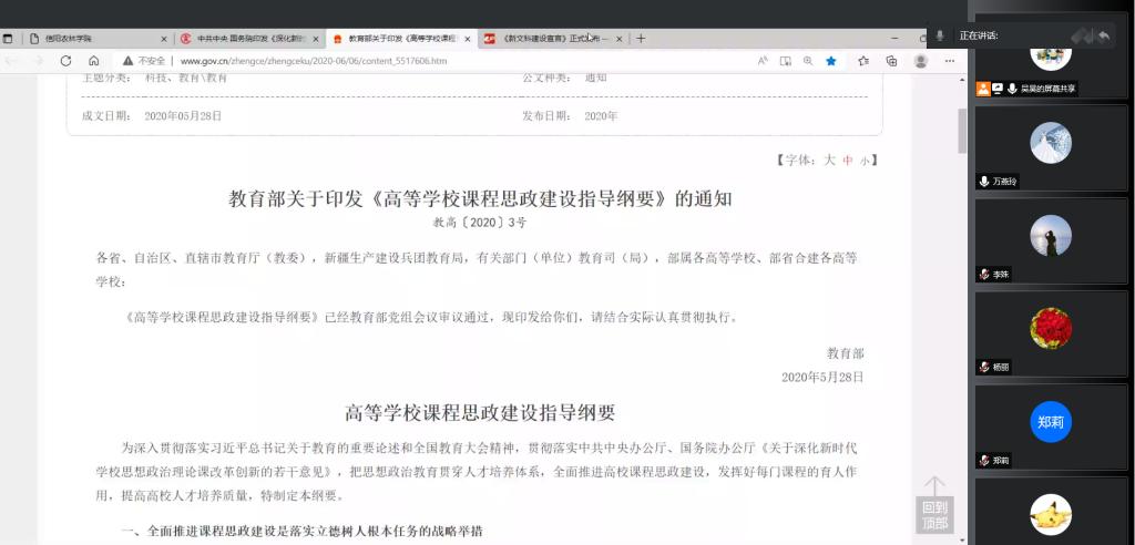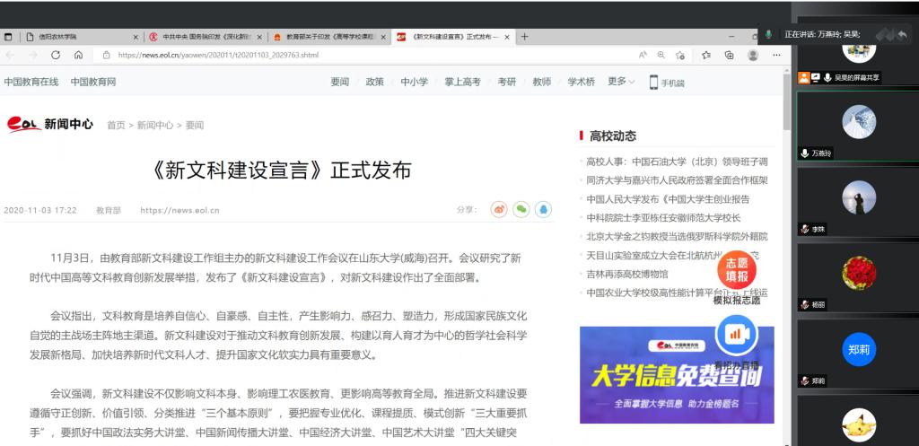 会上,形势与政策教研室全体教师集中学习了《新文科建设宣言》、《教育部关于高等学校课程思政建设指导纲要》和中共中央国务院印发《深化新时代教育评价改革总体方案》等材料,参会教师结合自身教学工作,进行了积极思考和讨论。