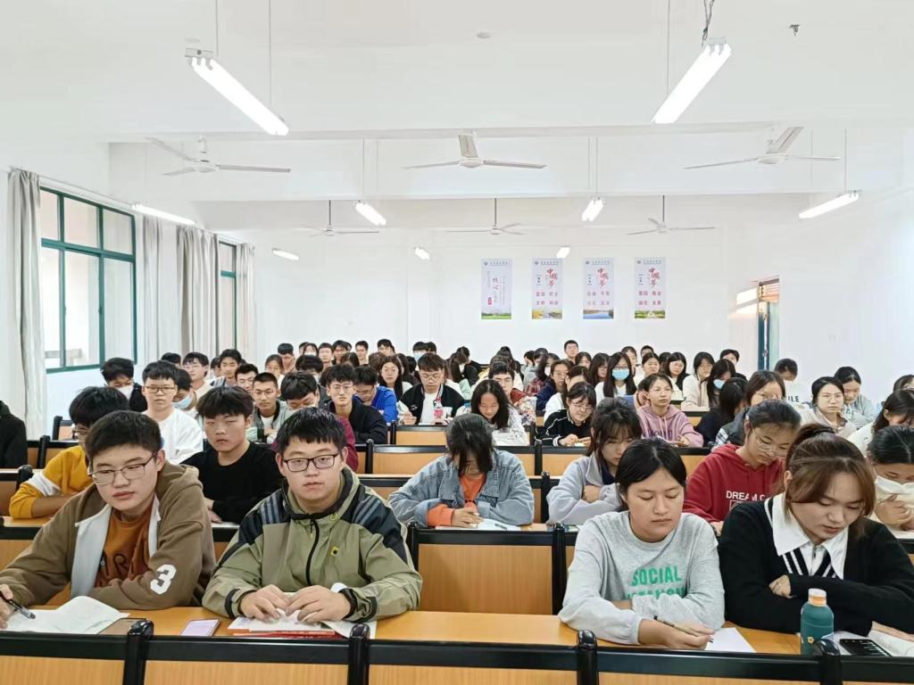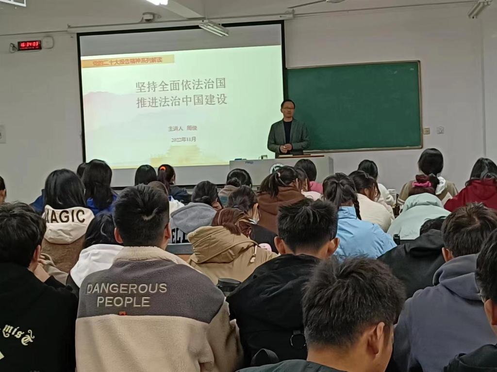 2022年11月14日下午,马克思主义学院副院长周俊以“坚持全面依法治国,推进法治中国建设”为主题,为食品学院2022级新生宣讲党的二十大精神。