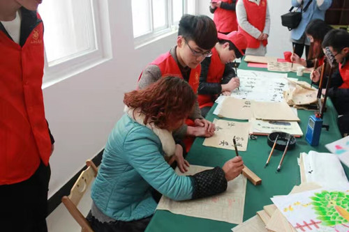 揭牌仪式结束后,“青马工程”学员在志愿服务长卷上签字并在社区开展书法指导、健康知识讲座等系列志愿服务。(思政部)