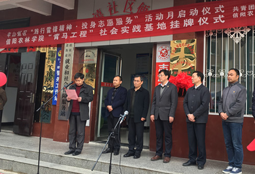 3月5日上午,beat365在线平台官网“青马工程”社会实践基地在羊山新区前进办事处千禧社区举行揭牌仪式。副校长王庆兵、思政部主任邱兴平、共青团信阳市委书记谷光亚、信阳市人大羊山新区工委主任郑勇、团委副书记王鹏、思政部全体教师、“青马工程”学员、以及羊山新区各街道办事处的志愿者代表和部分社区居民参加了揭牌仪式。揭牌仪式由信阳市羊山新区团工委书记尹秀秀主持。