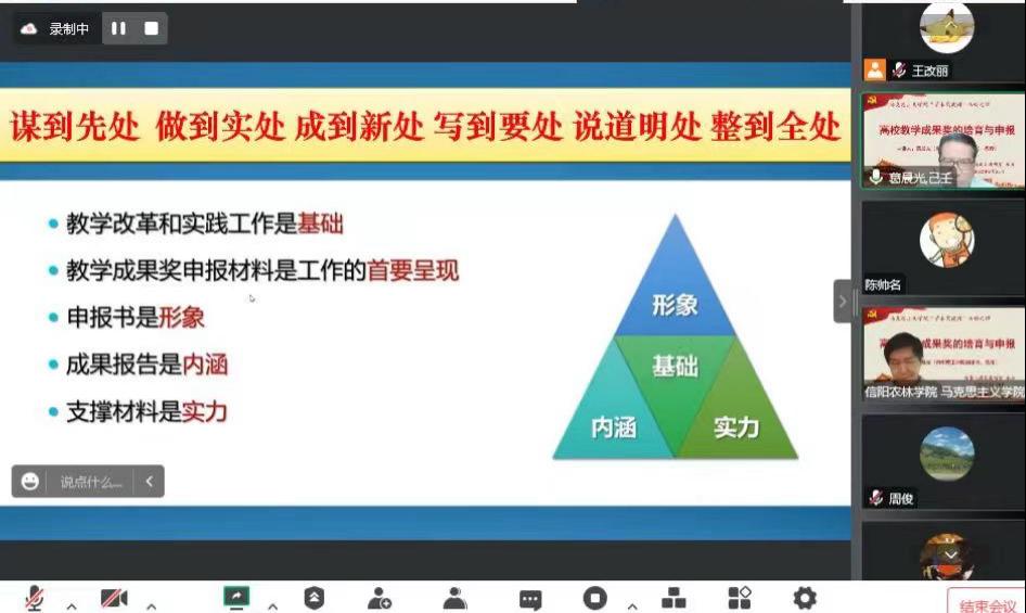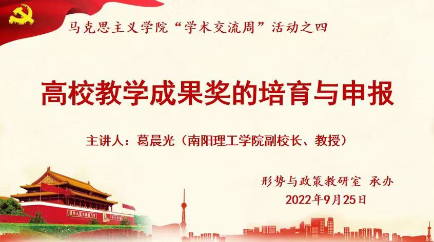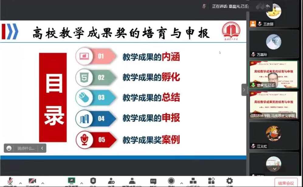 9月25日,beat365在线平台官网马克思主义学院举办学术交流周第四场讲座,邀请南阳理工学院副校长葛晨光教授线上作《高校教学成果奖的培育与申报》专题讲座。活动由院长邱兴平主持,全校思政课教师通过线上方式参加。本次线上讲座受到了省内外高校专家的关注,线上会议室观看人数达到500人次,取得了良好的效果。