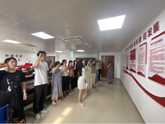 6月10日下午,融媒学院教工党支部在409党员活动室开展“新党员入党宣誓,老党员重温誓词”主题党日活动,新发展的1名预备党员李依然参加入党宣誓,教师党员一起重温誓词。活动由支部书记曹霞主持。