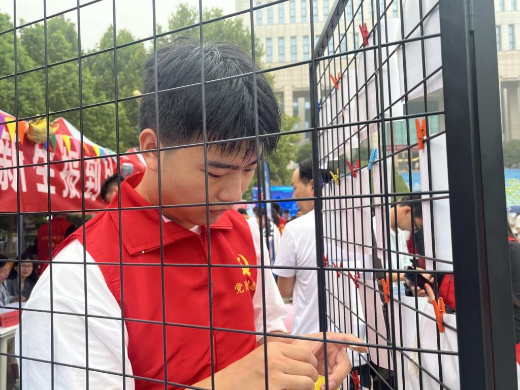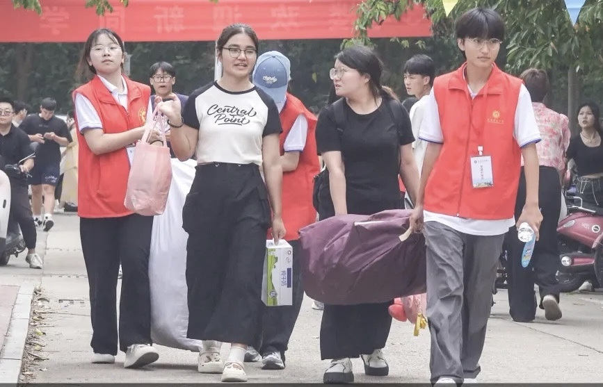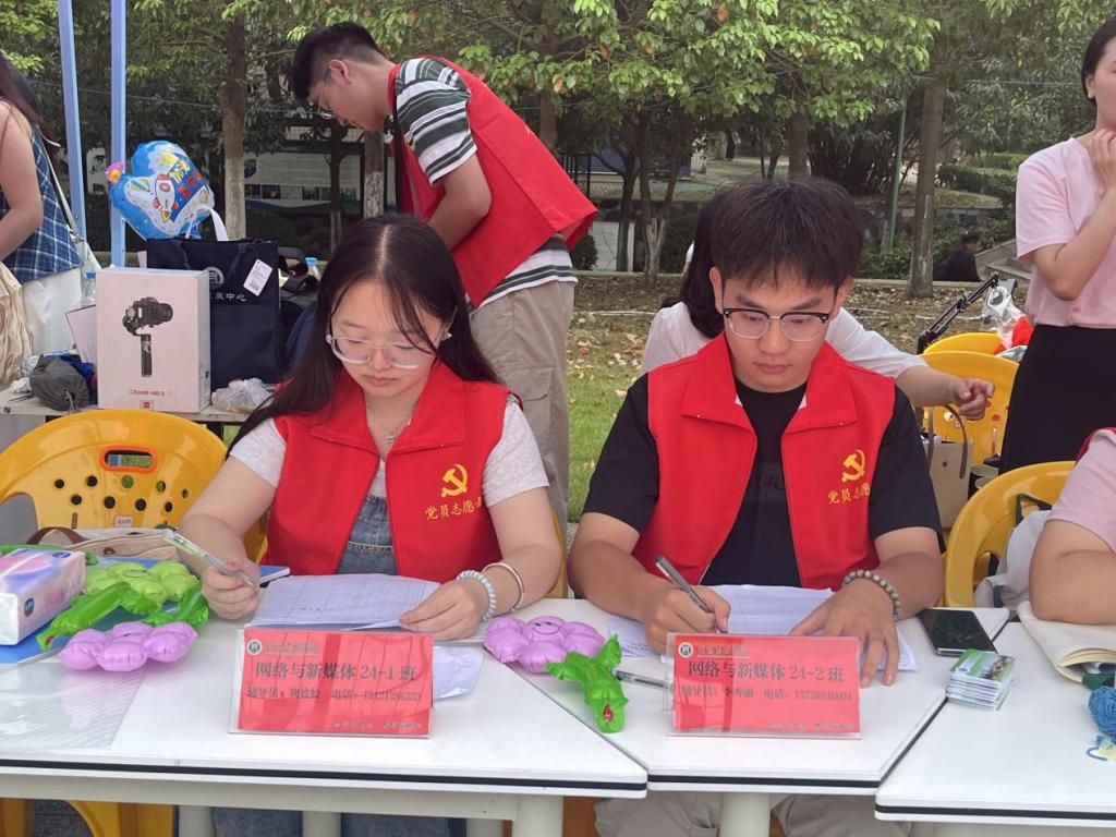 党员志愿者身着红色马甲,积极参与迎新活动的各个环节:新生引导员举着学院迎新牌守候在大小东门,帮助入校新生及家长指引道路、搬运行李,站好迎新活动的第一班岗哨。汝宁广场迎新点内的党员志愿者同样认真负责,迎新活动的前一天,已有许多志愿者到达现场负责特色展示布置;迎新活动当天,迎新点的党员志愿者仔细检查新生的入学材料并进行登记,同时认真解答各种入学的问题。