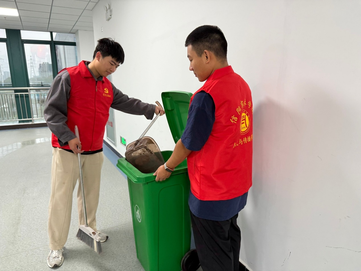 活动当天,党员志愿者们身着统一的志愿者服装,手持扫帚、拖把等清洁工具,准时来到美育实验室集合。在学院相关负责人的带领下,志愿者们迅速分组,明确了各自的分工和区域。志愿者们对实验室内的桌椅、讲台、地板以及教学用具进行了细致的清洁和整理,有的负责整理教学用具,有的则负责清扫地面,确保实验室的每一个角落都焕然一新。在美育实验室清洁工作完成之后,志愿者则又投入到学院公共区域的打扫工作中,他们穿梭在走廊、楼梯、大厅等区域,捡拾垃圾、清扫地面、摆放杂物,用实际行动传递着文明和卫生的理念。