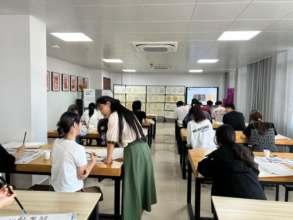 活动中,李冉首先讲解了书法艺术的渊源发展、五体书法艺术特色、历代书家名作欣赏、执笔运笔技巧、用笔用墨方法、学生初步接触篆、隶、行、楷、草的基本技法,并以“篆书进课堂,翰墨以致远”为书法活动主题,手把手教授学生临摹创作书法作品。通过欣赏作品、实践体验使大家感受到作者“求工于一笔之内,寄情于点画之间”的唯美情结。在古香古色的氛围中,学生运用笔墨纸砚体验中国书法艺术,用篆书书法艺术彰显中国古代文明。同学们兴致勃勃,时而相互交流,时而切磋成果,一堂课下来,不仅掌握了篆书用笔书写技艺,也感悟到了我国传统文化的内涵与精髓。