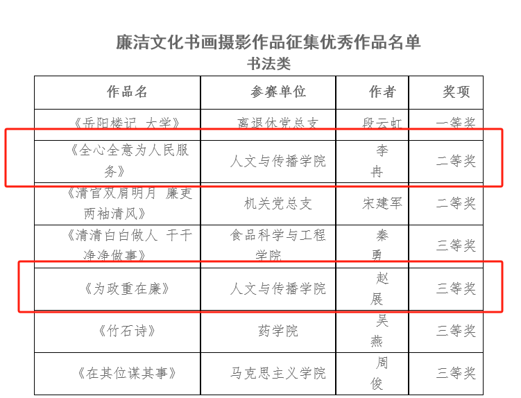我院对此次廉洁文化书画摄影作品征集活动高度重视,动员全院教职工积极参与,共评选出四项作品参与学校本次评选活动。其中李冉老师的书法作品《全心全意为人民服务》荣获一等奖,绘画作品《清风拂面沁人心廉洁前行以致远》荣获二等奖;赵展老师的书法作品《为政重在廉》荣获三等奖;王媛老师的绘画作品《固本清源方得始终》荣获三等奖。