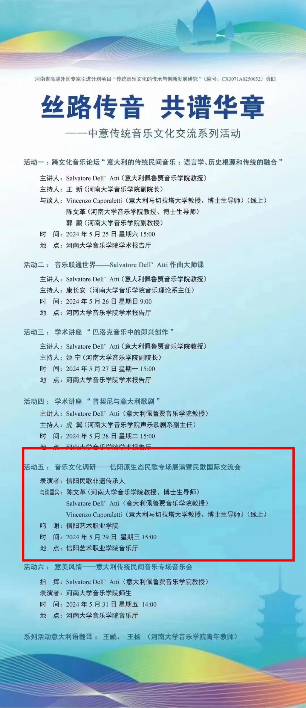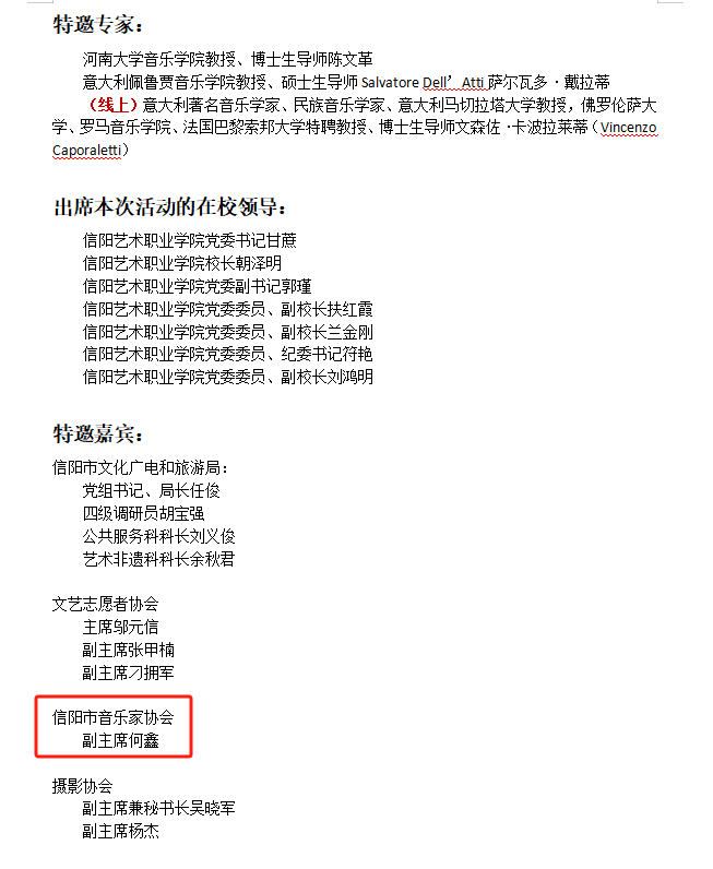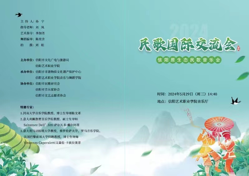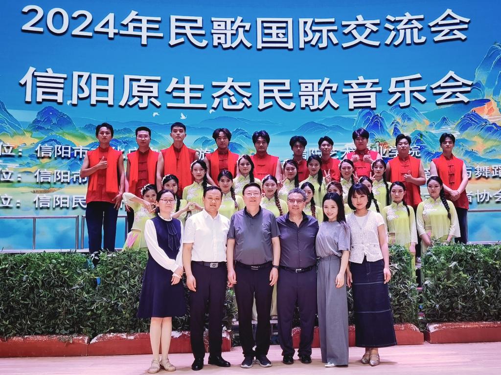 5月29日下午,由信阳市文化广电与旅游局、信阳艺术职业学院主办的“2024民歌国际交流会暨信阳原生态民歌音乐会”顺利召开,来自河南大学、beat365在线平台官网、信阳艺术职业学院、意大利佩鲁贾音乐学院、意大利马切拉塔大学、佛罗伦萨大学、罗马音乐学院、法国巴黎案邦大学等国内外高校专家学者,以及信阳市文化广电与旅游局、信阳文艺志愿者协会、信阳音乐家协会、信阳摄影协会等单位领导及文艺代表齐聚信阳艺术职业学院音乐厅,邂逅中华优秀传统文化,以歌会友、以声传情,增进民间艺术交流,传承国际友好关系,人文与传播学院副院长何鑫受邀并带领学院教师参加本次交流会。