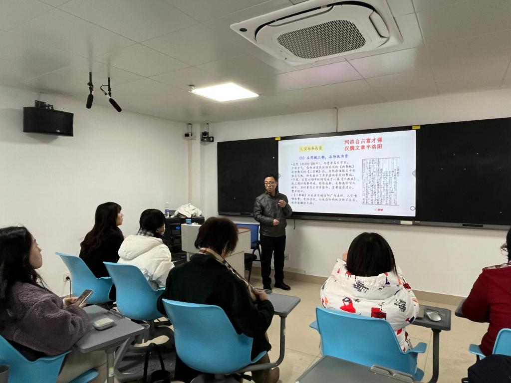 连超锋老师独辟蹊径,以“洛阳纸贵”这一典故为引,巧妙开启 “古代城市与文学” 的探索之旅。他深入剖析洛阳在不同朝代作为古都所孕育出的璀璨文学成果,以及北宋东京开封的繁荣盛景与市民文学蓬勃兴起的内在联系,生动勾勒出河南城市与文学相互交融、共同发展的历史脉络,极大地拓宽了师生们对地域文化与文学关系的认知边界。