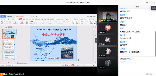 为进一步增强学生安全意识,提高安全防范能力,避免溺水事故的发生,6月2日,文学艺术学院18级辅导员王蕾老师、19级辅导员李静老师分别用腾讯会议app召开“防溺水安全教育”线上主题班会,文秘18级、19级全体学生参加了此次班会。