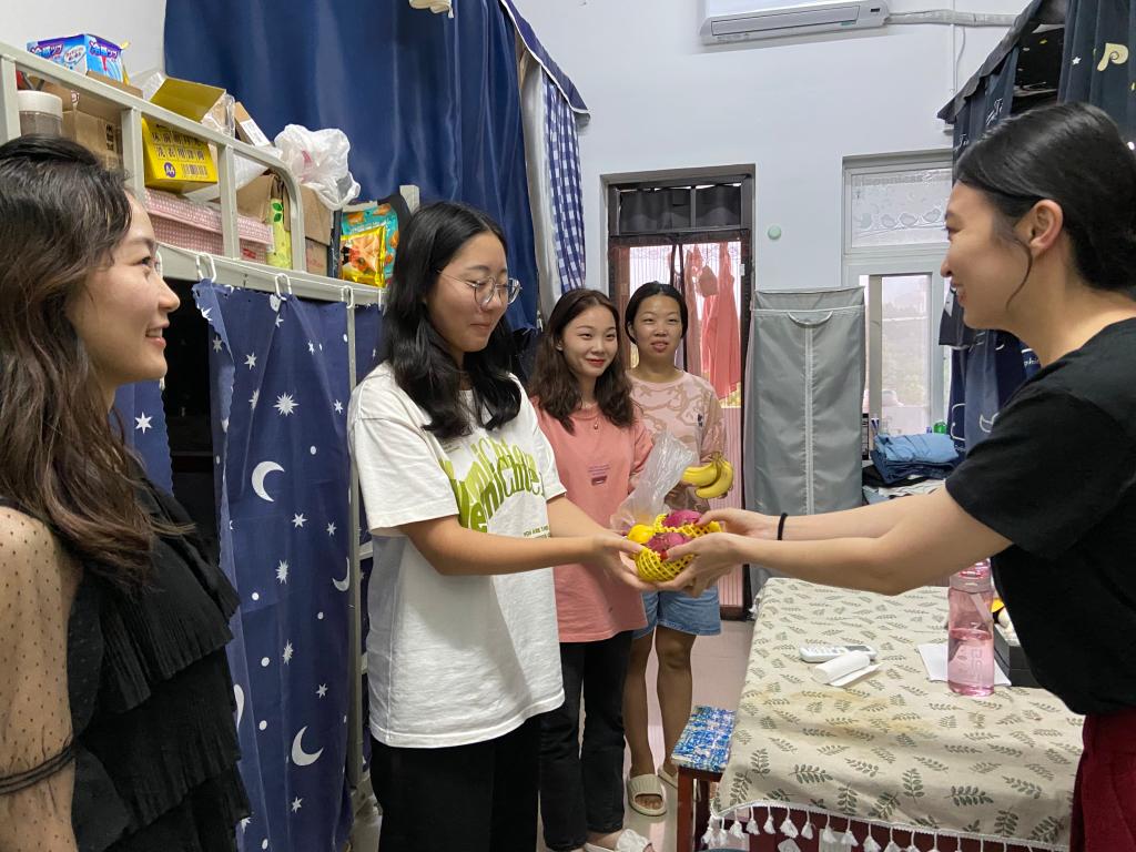 团总支书记王蕾老师和辅导员李依然老师深入学生宿舍,不仅对学生在寝室的学习生活情况进行了关心,而且就学习过程中存在的问题以及同学们反应的意见和建议也逐一进行了解和记录。同时,老师们为每位学生赠送了月饼等节日礼品,特意叮嘱同学们,不仅要开心过节,同时也要继续做好疫情防控,要做到过一个快乐且安全的中秋节。