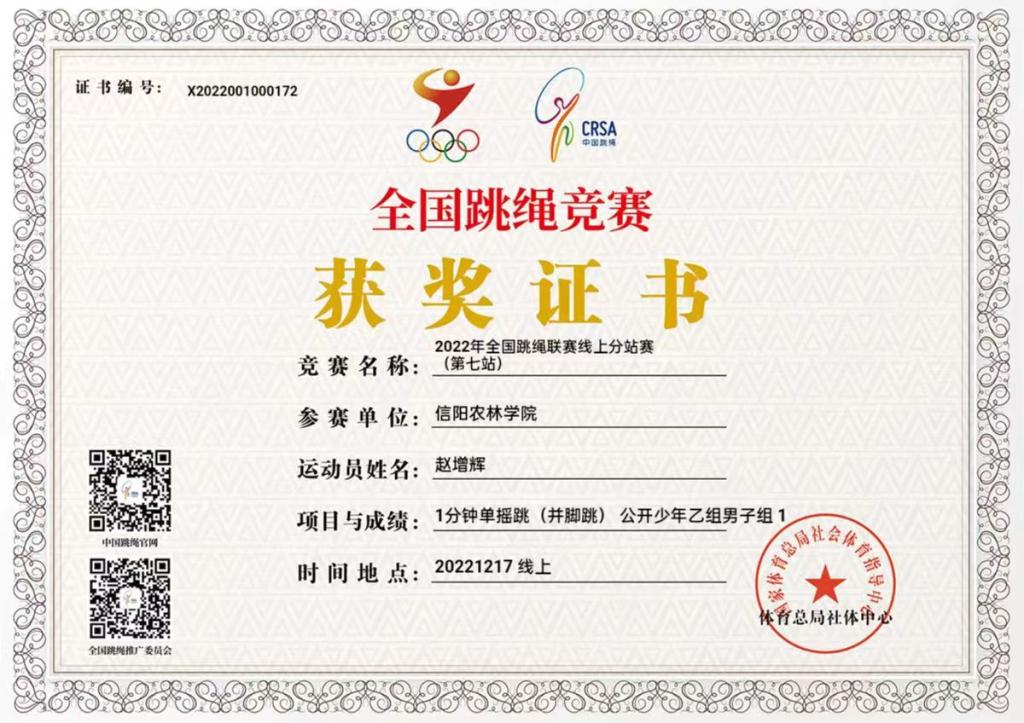 我院赵增辉同学在2022年全国跳绳联赛线上分站赛中获得好成绩