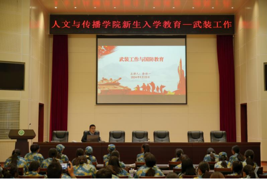 为了让新生能够更快地适应大学生活,人文与传播学院于9月23日下午在图书馆六楼报告厅开展2024届新生入学主题教育,本次活动的主题是“学生管理与国防武装工作”。本次活动由余功一老师主讲,2024级全体新生身着军训服装参与此次讲座。在学生管理方面,余老师从奖学金管理、请销假制度、寝室安全管理、防电信诈骗等方面为同学纾解了心中的困惑与开学的迷茫,让同学们可以更加深刻地树立正确的价值观和行为规范、认识到严格自我管理对于大学生活的重要意义。
