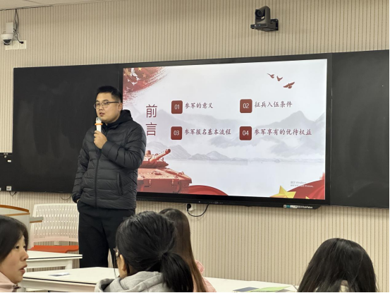 余功一首先分享了习近平总书记给青年的寄语,“当代中国青年是与新时代同向而行、共同前进的一代,生逢盛世,肩负重任。”习近平总书记的重要讲话蕴含着谆谆嘱托,寄予着殷殷期望。余功一鼓励同学们积极响应国家的号召,携笔从戎,不负韶华,积极投身军营建功立业,激发了大家报国参军的热情和斗志。随后,余功一对于信阳市兵源地毕业生征兵入伍政策进行了解读,从优待政策、入伍条件、应征流程、职业发展等四个方面详细阐述了大学生征兵入伍政策,并向同学重点解读了服役期间的经济待遇、个人发展和退役后的优待,为有意向入伍的同学提供全面的信息支持。宣讲结束后学生进行了积极的互动提问。