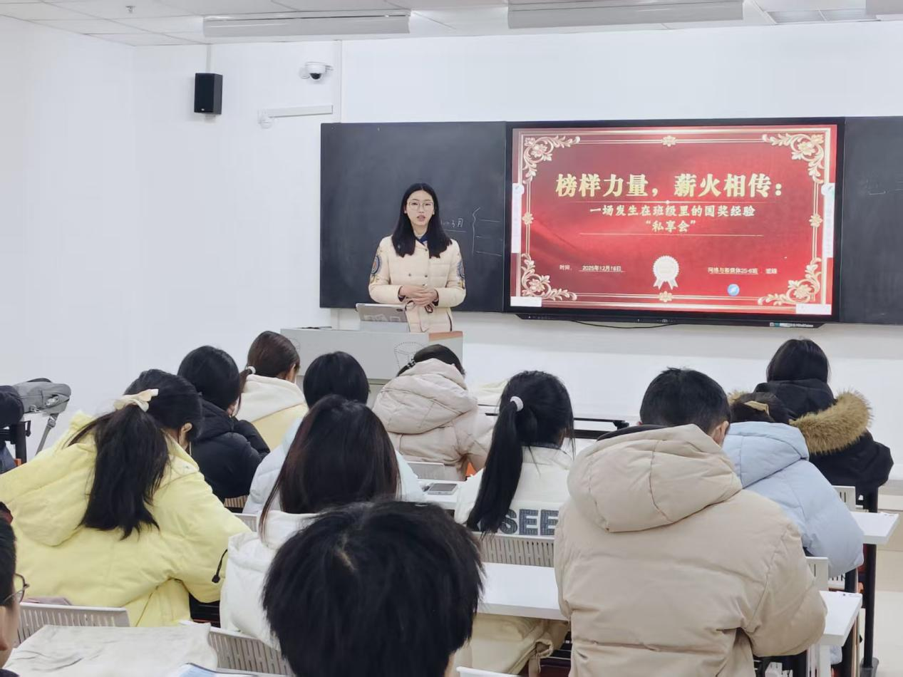 为进一步发挥优秀学生的榜样示范作用,加强学风建设,引导新生明确学习方向、科学规划大学生活,12月16日晚,我院特别组织了一场以“榜样力量,薪火相传”为主题的国家奖学金获得者经验分享活动。本次活动一改传统的大型报告会模式,创新性地以“私享会”形式,我院2024-2025学年国家奖学金获得者周莹莹和2025-2026学年国家奖学金获得者马茜,深入网络与新媒体专业2025级新生班级,与学弟学妹们进行了一场近距离、面对面的深度交流。