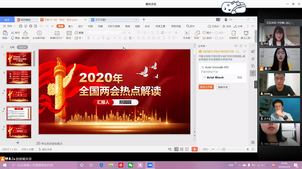 会议伊始,各班辅导员带领同学们一同观看两会的相关视频并听取工作报告。2020年是决胜全面小康、决战脱贫攻坚收官之年和“十三五”规划收官之年,习近平总书记在会议期间,紧紧围绕统筹推进常态化疫情防控和经济社会发展、落实决战决胜目标任务、以人民为中心的发展思想、经济形势、公共卫生防护、国防和军队建设等一系列重大问题发表重要讲话。其中,“疫情防控”、“提振经济”、“决胜脱贫攻坚”、“保障民生”和“高质量发展”是今年政府工作报告的关键词。随后,辅导员带领同学们一起学习了政府工作报告中的具体内容,通过及时学习两会精神,同学们了解到我国当前的发展前景,虽受疫情影响,但我国经济长期向好的基本趋势不会改变。