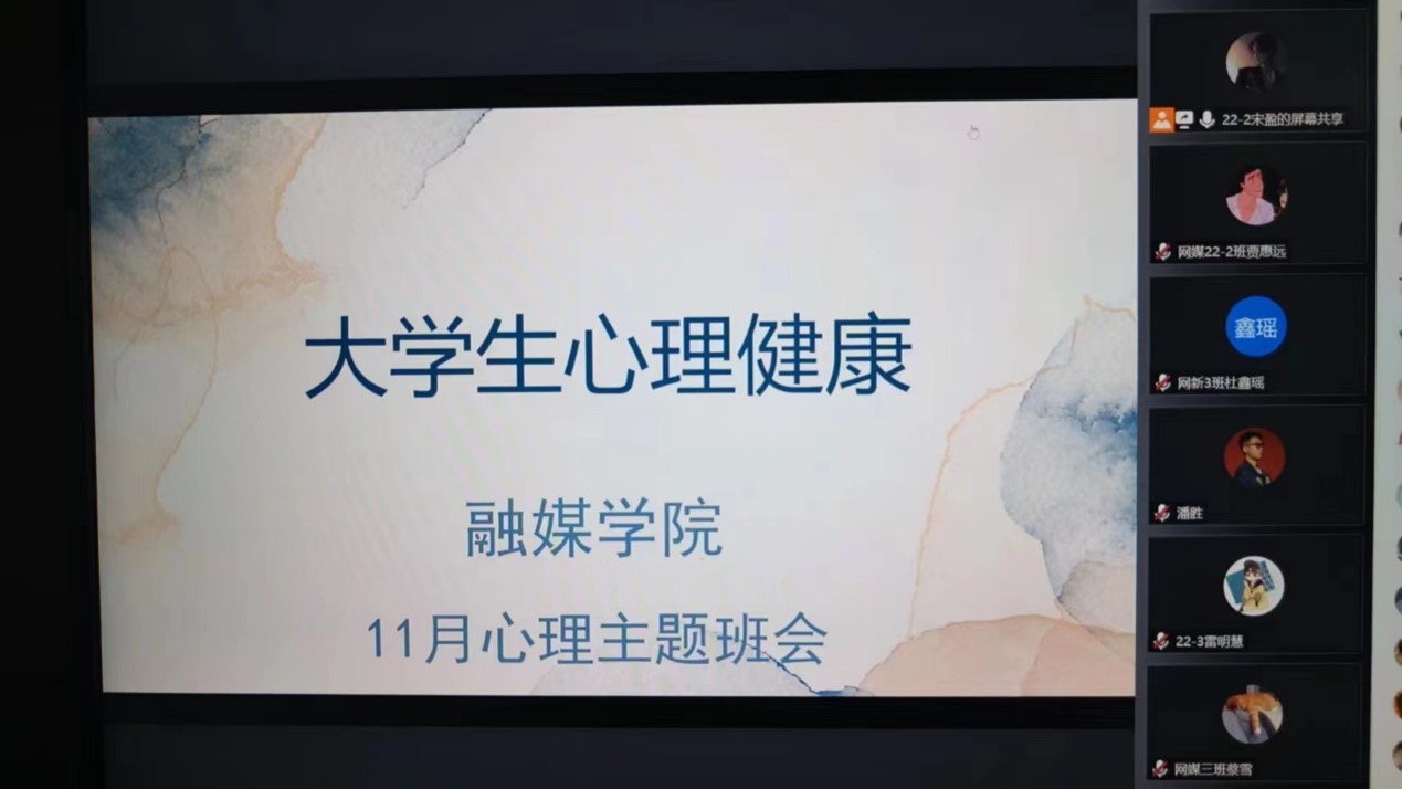为普及心理健康基本知识,帮助同学们更好认清自身,营造更好的校园心理健康氛围,2022年11月11号,融媒学院网络与新媒体专业22级全体学生以线上会议形式开展心理健康知识普及主题班会。本次班会由学生会心理健康部组织,心理部部长朱家悦担任主持。