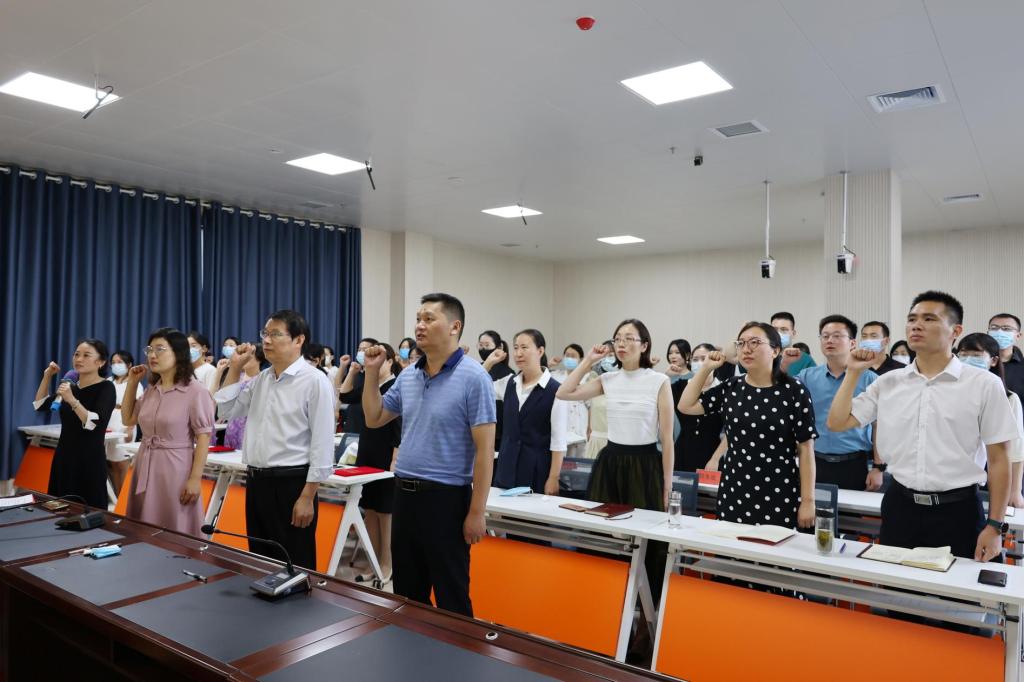32名新入职教师在教师发展中心副主任孙君艳的带领下庄严宣誓,掷地有声的誓词,紧握高举的右拳,是每一位新教师的自我期许,更是对教育事业的庄严承诺。