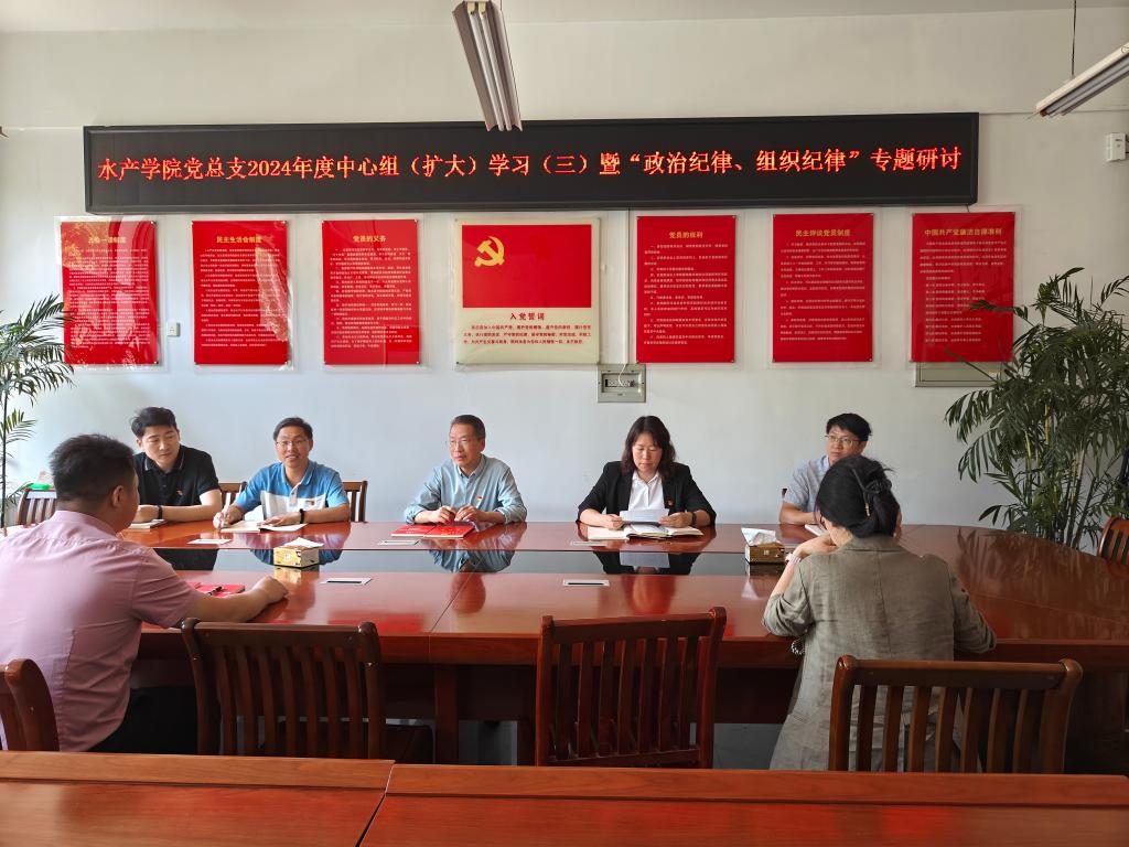 5月10日,水产学院党总支开展2024年度中心组(扩大)学习(三)暨“政治纪律、组织纪律”专题研讨会。会议由水产学院党总支书记黄光玲同志主持。学院党总支成员和各党支部书记参加会议。