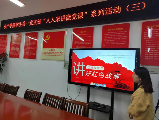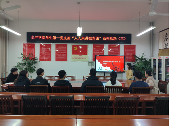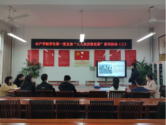 4月4日下午,水产学院学生第一党支部开展“人人来讲微党课”系列活动第三期。本期活动依然采用线上线下相结合的方式在2C330党员活动室和腾讯会议同步进行。活动由学生第一党支部书记晏方舟同志主持,支部全体党员参加。