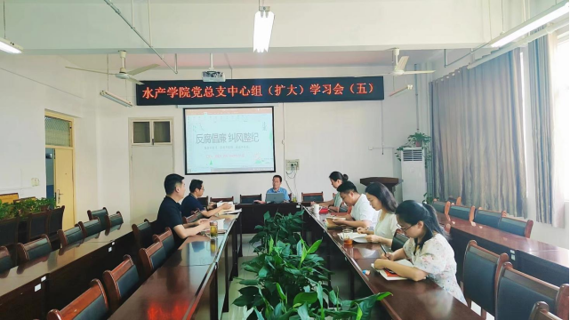 6月13日下午,水产学院党总支在2C330党员活动室召开2023年度第五次中心组(扩大)学习会,会议由水产学院党总支书记、院长郭旭升同志主持,学院党总支成员和各党支部书记参加会议。