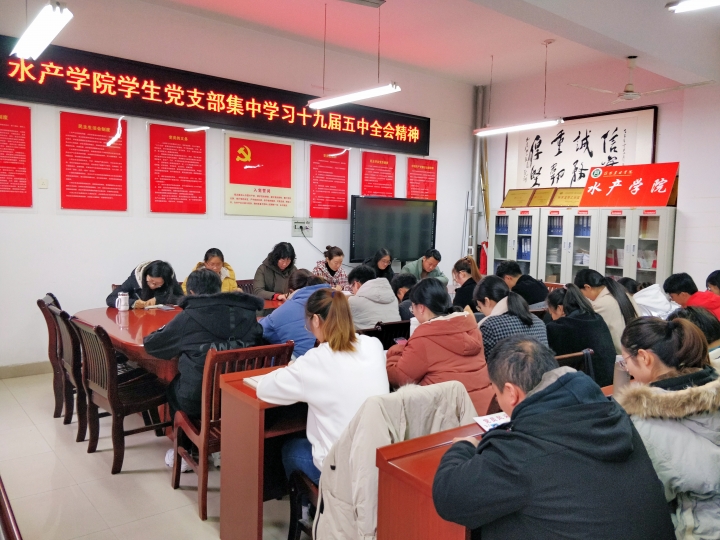 2020年11月25日,在2C330会议室,水产学院学生党支部集中学习第十九届五中全会精神。参会人员有水产学院黄光玲老师,晏方舟老师,李建玲老师,龚静老师,刘开放老师等,以及水产学院学生党员和预备党员,晏老师主持会议。