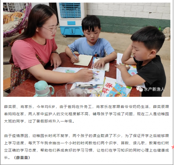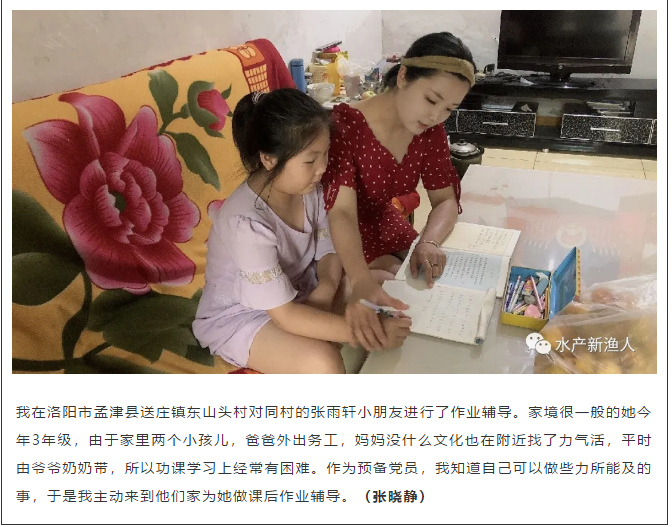 新冠肺炎疫情至今,我们经历了很多,也见证了很多,全民战“疫”,共克时艰。医护人员、人民警察、党员干部,还有自告奋勇加入战“疫”的各行各业的志愿者们,他们为人民守护,担时代责任。那么作为学生党员,如何积极为社会做出力所能及的贡献?怎样真正在大考中实现青春价值?水产学院学生党支部为充分发挥大学生党员先锋模范作用,担当共产党员的职责使命,彰显服务本色,号召学生党员们行动起来,主动为自己生活、实习所在村里的贫困学生和留守儿童辅导作业,同时关注孩子们心理健康,给他们带去关心和欢笑。