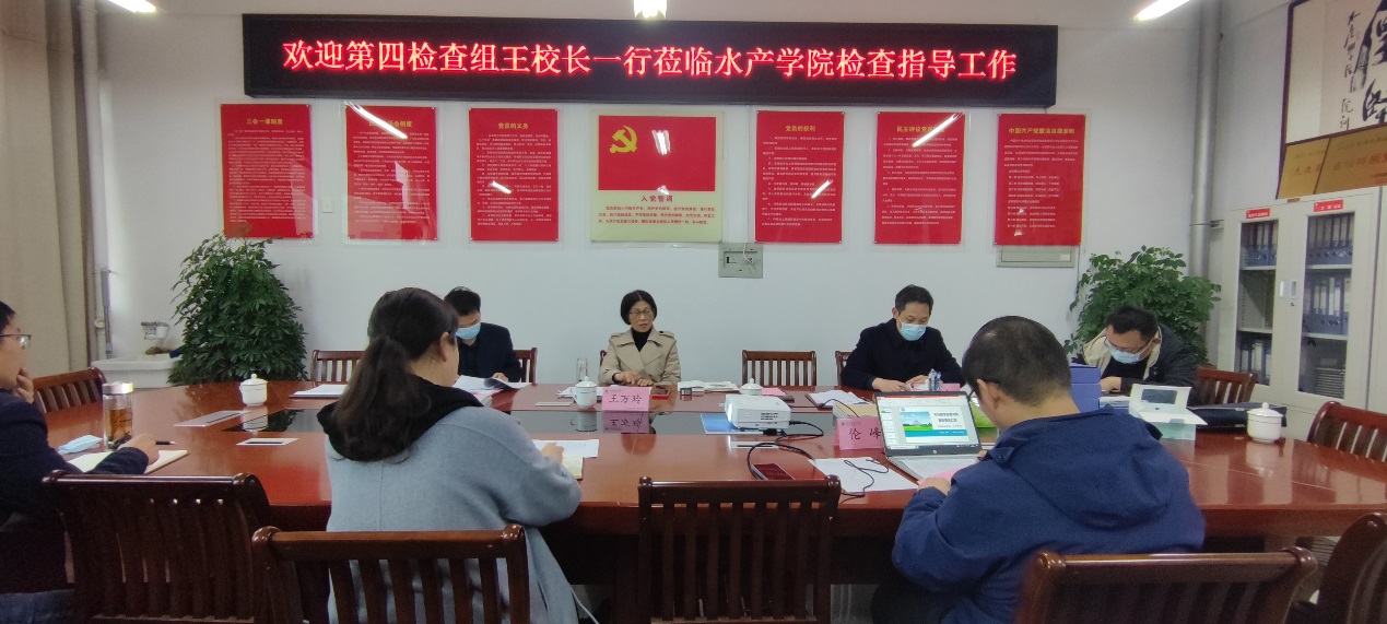 3月31日上午,校本科教学合格评估整改第四督查组一行四人在王万玲副校长带领下,莅临水产学院检查指导工作。水产学院副书记黄光玲、副院长伦峰、吴坤杰参与此次会议。