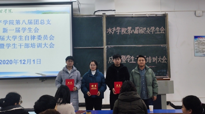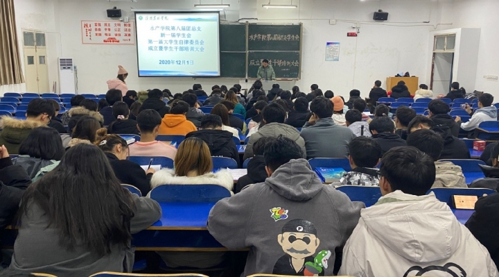 2020年12月1日下午四点三十,水产学院第八届团总支、新一届学生会、第一届大学生自律委员会成立暨学生干部培训大会于一教E102成功举办。水产学院党总支副书记黄光玲老师,水产学院团总支书记刘开放老师,水产学院学工组段丁毓、檀晨曦老师,水产学院新一届团总支、学生会、自律委员会成员及20级同学出席大会。