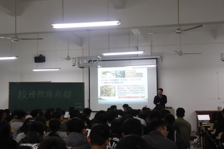 杨东辉院长首先以水产专业认知为主,从渔业资源与环境领域、生物技术与遗传育种领域、水产养殖领域、水产病害领域、水产加工领域、水产品质量安全领域、渔业装备与节能减排领域等方向,为同学们详细地介绍了我国水产行业发展的现状与趋势。之后,杨院长向同学们详细的介绍了我院的师资队伍、实验科研条件、学生实习就业、考研深造等与学生紧密相关的内容。
