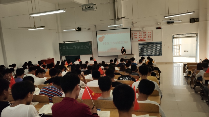 为了帮助2019级新生充分了解学校的规章制度,创建和谐稳定校园环境,9月29日下午三时,在二教404教室伴随着教室内的红旗飘动,2019级全体新生在喜迎祖国70周年庆的氛围下参加了此次学习,由新生辅导员段丁毓主讲。