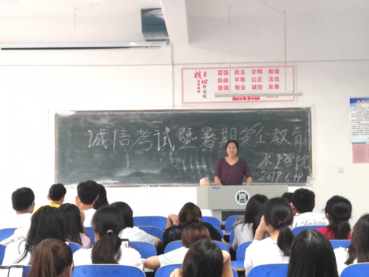 期末考试临近,诚信考试是每个大学生都应当遵循的内在要求,然而随着不诚信现象的偶尔发生,考试诚信宣传仍然需要不断的加强。6月19日,水产学院在1教A205、C202、105分别开展了诚信考试暨暑假安全教育会,团总支书记晏方舟,辅导员冯德祥、李建玲,在校参加考试的全部学生参加会议。