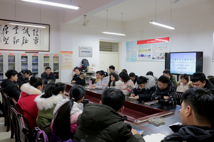 12月12日下午,水产学院团总支召开主要学生干部培训会。院长杨东辉、组织员黄光玲、团总支书记晏方舟、全体学生党员和主要学生干部参加了此次会议。
