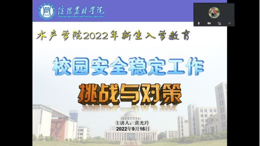 9月16日上午8点,水产学院在腾讯会议召开了2022级新生安全教育宣讲会。水产学院党总支副书记黄光玲主讲。2022级新生辅导员级全体新生参加了本次活动。