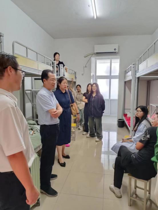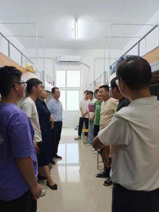 随后郭旭升带队深入宿舍看望2023级新同学,在与同学们进行亲切交谈中,了解他们的家庭情况,解答同学们的疑问,解决同学们刚到校碰到的困难,提醒同学们要尽快熟悉校园、结伴出行、远离校园贷、邪教传播等,鼓励同学们在校期间要互帮互助、处理好宿舍人际关系、注意水电安全、养成良好的生活习惯。(撰稿:陈浩;审稿人:刘开放;终审:黄光玲)