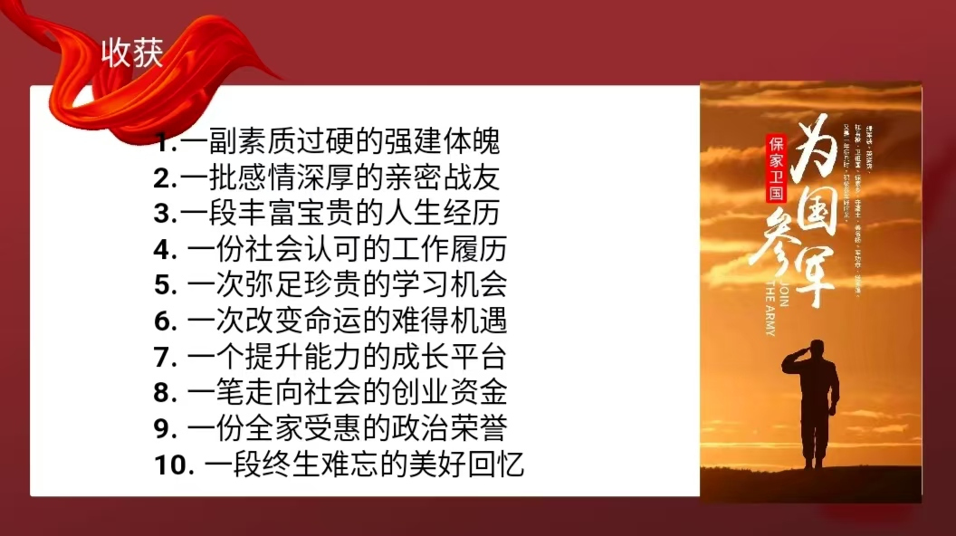 何柏喜同学首先讲述了入伍之后的规律作息,随后详细列举了入伍所能享受的优惠政策,包括学费补助、每月津贴、区补助、国家补助等。在谈到大学生进行军考时,他鼓励同学们在部队中积极进取,努力提升自己的综合素质,为未来的职业发展打下坚实的基础。退役军人在考研、就业等方面也享有优惠政策,为他们顺利融入社会提供了有力保障。他还讲到“部队的学习和生活让我成长颇多,在那里我学会了勇敢和团结协作,亲身见证了新时代中国青年应该是什么模样,收获了一笔宝贵的精神财富。”并且鼓励同学们要树立正确的价值观,将个人理想与国家发展紧密结合起来,为祖国的繁荣富强贡献自己的力量。