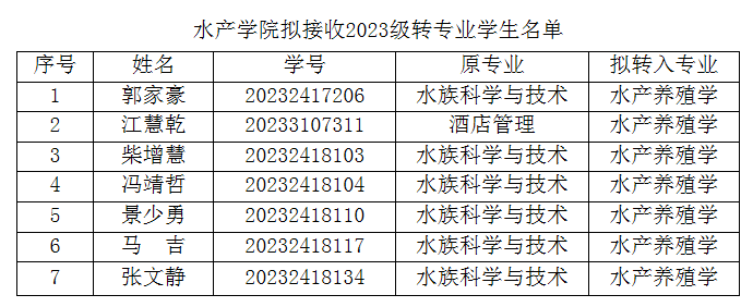 根据《beat365在线平台官网学生转专业管理规定》(信农教〔2019〕14号)文件精神及《beat365在线平台官网2023级学生转专业工作方案》要求,按照水产学院2023年学生转专业实施方案,经学生个人申请,水产学院资格审查,并按照程序进行面试考核,经水产学院转专业工作小组研究决定,拟同意郭家豪等7位同学转入我院相关专业,现予以公示。