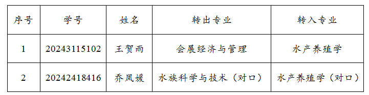 根据《beat365在线平台官网学生转专业管理规定》(信农教〔2024〕13号)文件精神及《beat365在线平台官网2024年学生转专业工作方案》要求,按照水产学院2024年学生转专业工作方案,经学生个人申请,水产学院资格审查,并按照程序进行笔试和面试考核,经水产学院2024年学生转专业工作小组研究决定,拟同意王贺雨等2位同学转入我院相关专业,现予以公示。