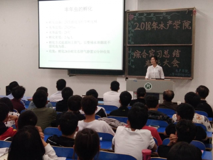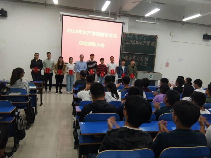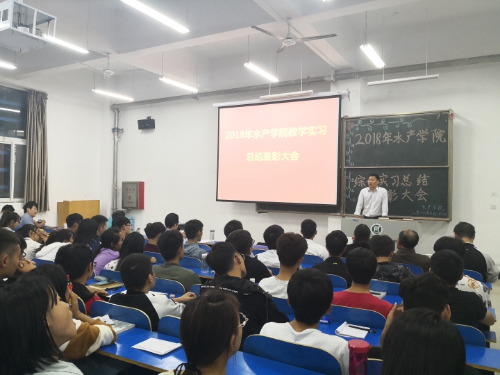 月26日晚,水产学院在E201教室召开了2018年教学实习总结表彰大会。水产学院院长杨东辉、党总支书记郭旭升、副院长周本翔、通威股份华中一区总裁助理兼合肥通威市场部经理熊维峰、实习带队指导教师和2015级、2016级、2018级在校生参加了大会。会议由教学秘书伦峰主持。