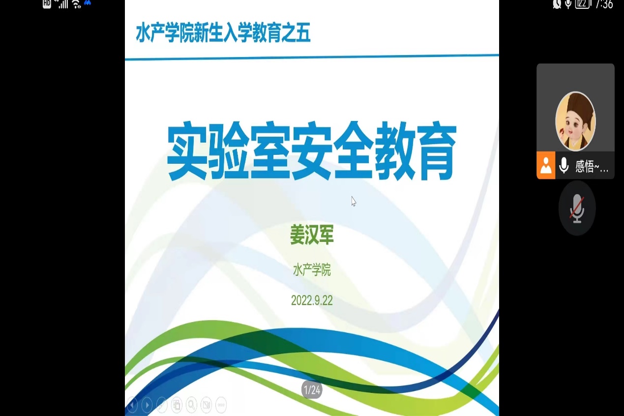晚上,水产学院专职实验教师姜汉军使用线上会议方式,对水产学院2022级全体新生进行了实验室安全教育。教育内容包括实验室安全事故视频、实验室安全重要性、危险化学品的使用和防护知识等方面。