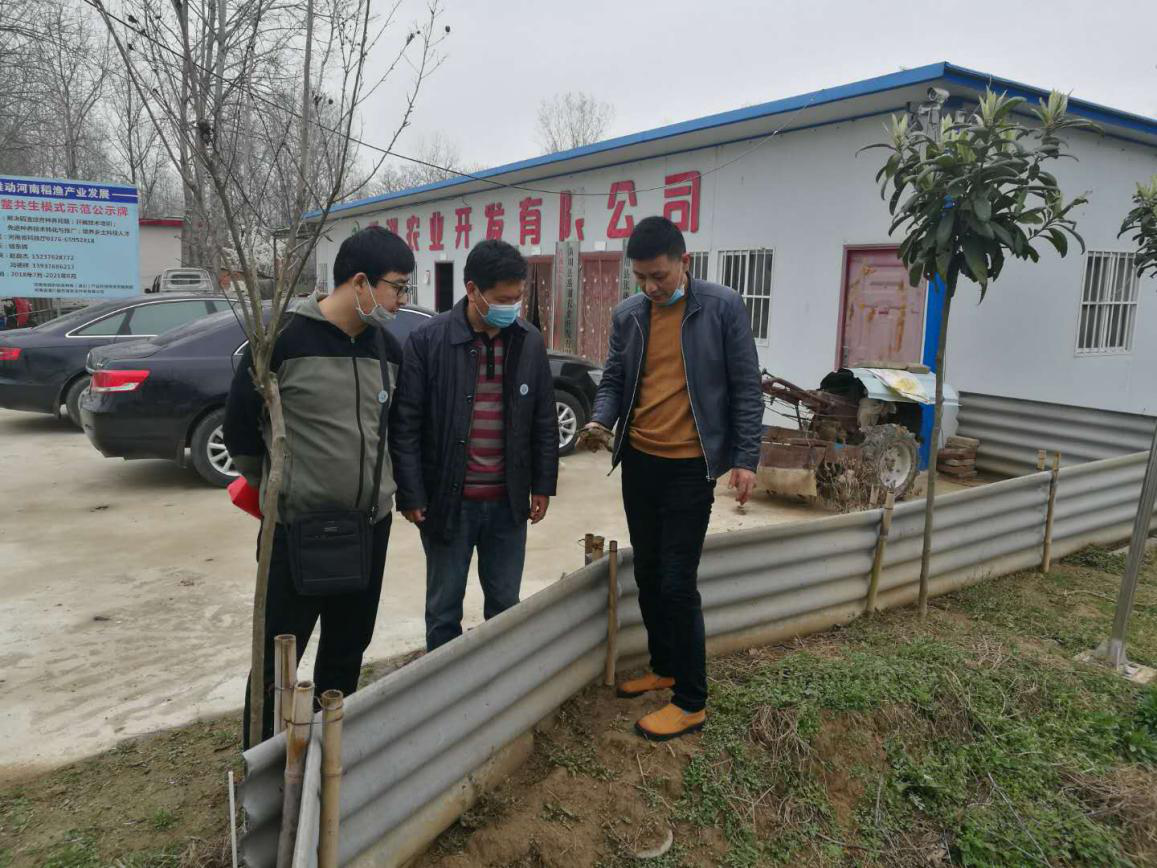 第二站服务团来到华来时代,询问负责人虾苗生长及交易情况,针对疫情导致滞销情况,服务团建议到河南省科技特派员助力脱贫攻坚微信公众平台发布小龙虾苗种的供求信息,并协助合作社拍摄图片、录制视频以及信息整理发布事宜;接着同潢川县水产局副局长刘征查看了稻虾基地,对开展新模式的示范和推广进行了探讨。