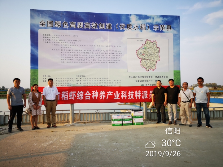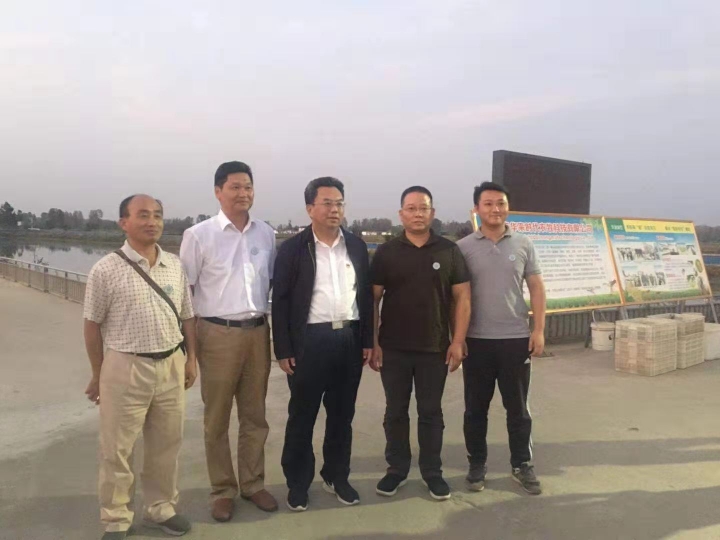 恰逢河南省科技厅厅长马刚、信阳市科技局局长黄刚、信阳市政府副秘书长周永兵、潢川县县长兰恩民也来到潢川县华来时代农牧科技有限公司进行调研,服务团团长杨东辉向马厅长一行汇报了“稻-虾-鳖”连作养殖模式。马厅长通过实地考察后充分肯定 “稻-虾-鳖”连作养殖模式,指示服务团一定要总结好经验、加大推广力度,巩固脱贫攻坚的成果,助力潢川乡村振兴。(水产学院)